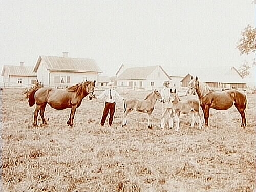 Titel: Två st. envånings bostadshus och ekonomibyggnader, två män med två ston och två föl. Petrus Johansson