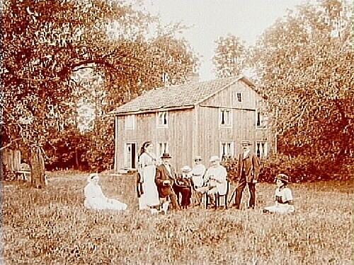 Tvåvånings bostadshus, 8 personer framför bostaden.