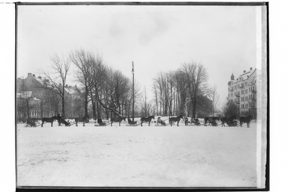Slädparti vid Oskarsparken, utmed Trädgårdsgatan, 8 slädar med hästar.