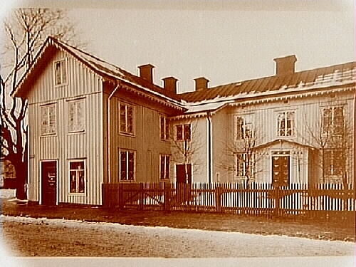 Vinkelbyggt tvåvånings trähus med förstebro, framsidan.