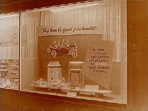Skyltfönster på Systembolaget (?) med gasolprodukter.