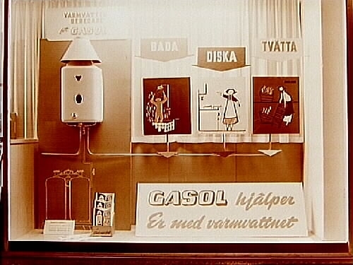Titel: Svenska skiffer AB:s skyltfönster med varmvattenberedare och motorvärmare.
