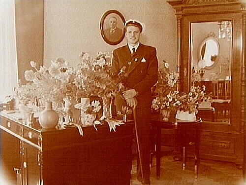 Titel: Rumsinteriör. Studentexamen, Almkvist med blommor.