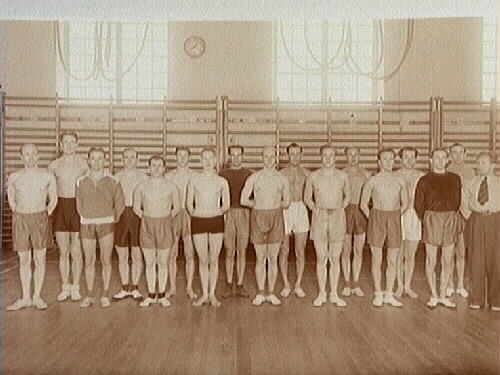 AGF gymnastikförening, gruppbild, manliga morgonavd , 17 herrar i gymnastiksalen.