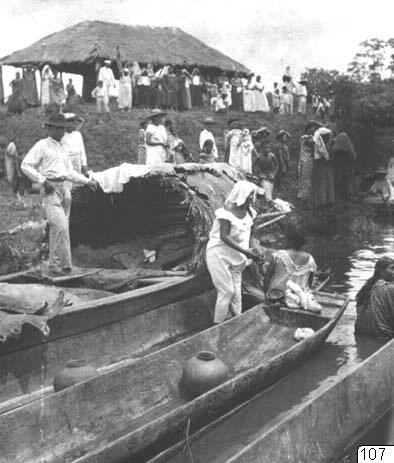 Motiv: Motiv från hamnen i Carmen. Lokal: Carmen, R. Blanco, bifl. till Guaporé, n.ö. Bolivia. Stam: Baure /civiliserade/. Foto av Erland Nordenskiöld, febr. 1909, erhållet genom dito, datum okänd. Publ. Nordenskiöld: Indianer och Hvita. Stockholm 1911, tafla 18. (katalogkort)