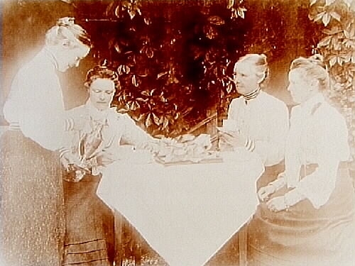 Rumsinteriör, 4 kvinnor kring kaffebordet.