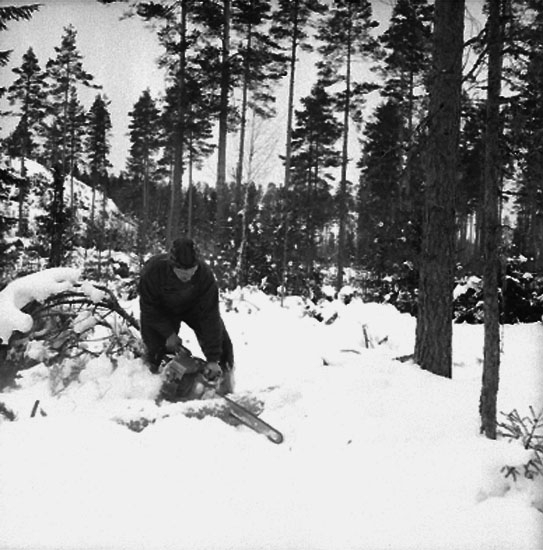 Skogsbruk, trädfällning, en man med motorsåg.