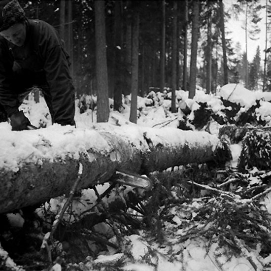 Skogsbruk, trädfällning, en man med motorsåg.