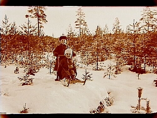Två barn, Sven Lindskog 5 år och Karl-Erik Lindskog 7 år, med sparkstötting.