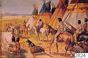 Blackfeetläger i Montana 1850 som besöks av en grupp creeindianer. Prärieområdet.