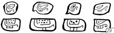 Sk. 1-53. Detaljer till mayabildskrift om fickräkning o dyl. Bilderna efter S. G. Morley: An introduction to the study of the Maya hieroglyphs. Washington, 1915. BAEBull .57.