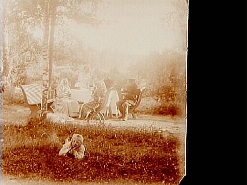 Titel: Familjebild, sju personer. Två bilder (8x8 cm) på samma glasplåt (8x17 cm).