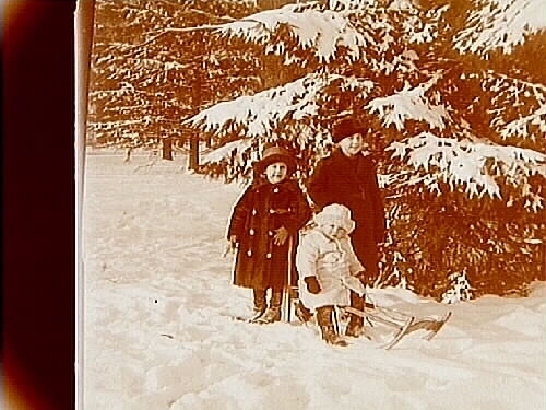 Titel: Familjebild, tre barn med sparkstötting. Sam Lindskog Två bilder (8x8 cm) på samma glasplåt (8x17 cm).