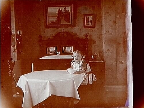Titel: Familjebild, en liten flicka. Rumsinteriör. Sam Lindskog Två bilder (8x8 cm) på samma glasplåt (8x17 cm).