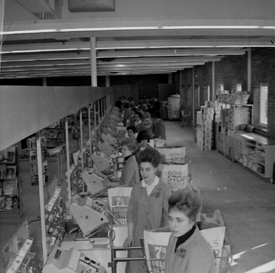 Titel: Konsums Domus stormarknad, öppnandet. Affärsinteriör, kunder och personal.