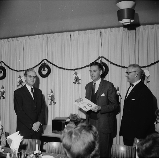 Titel: Avskedsfest för L.C. chefen Torsten Östergren, interiör, grupp.