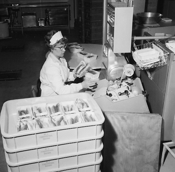 Titel: Konsum, interiör, packning av fisk, en kvinna.
