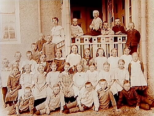 Rynninge skola, 33 skolbarn med lärarinnan på skoltrappan.