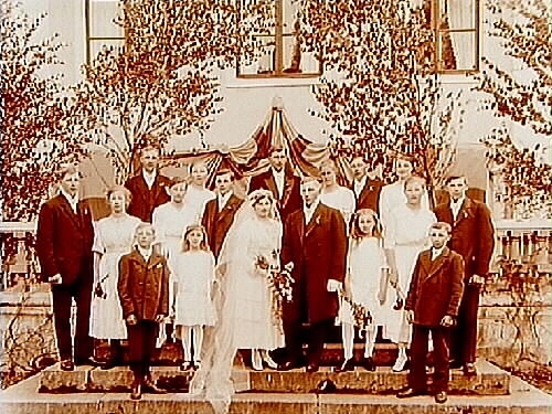 Bröllop. Brudpar och bröllopsgäster vid björkportalen.