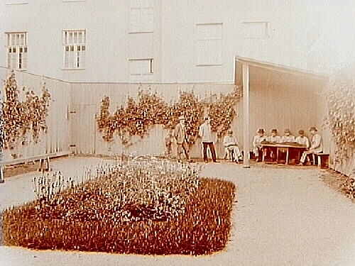 Försörjningsanstalten, promenadträdgården, 7 patienter och en vårdare.