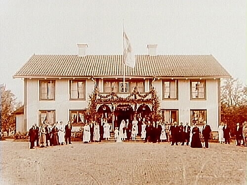 Bröllop. Brudpar med brudnäbbar på trappan. Bröllopsgäster framför huset.