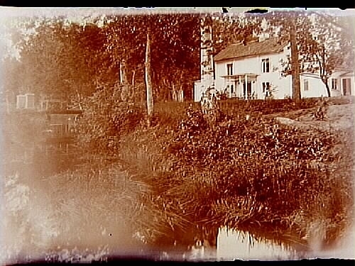 Tvåvånings bostadshus och bäcken.