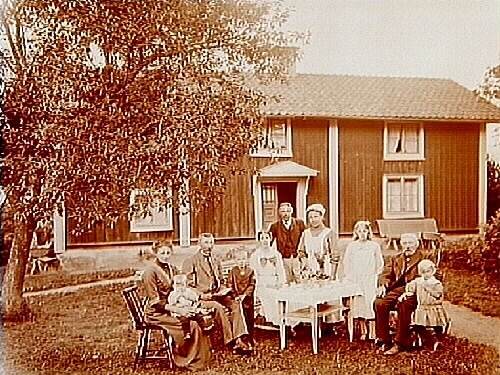 Tvåvånings bostadshus med förstubro, 10 personer framför huset.
