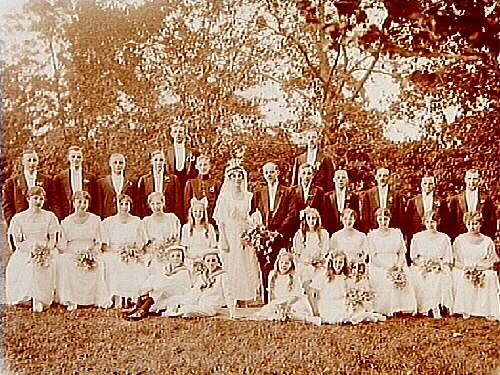 Bröllop. Brudpar, 12 marskalkar, 8 tärnor, 6 brudnäbbar.