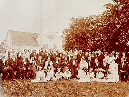 Bröllop. Brudpar, 7 brudnäbbar, en präst och bröllopsgäster.