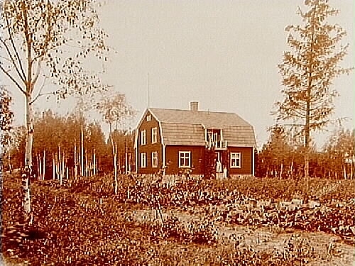 Tvåvånings bostadshus med brutet tak, liten balkong. 3 personer framför huset.