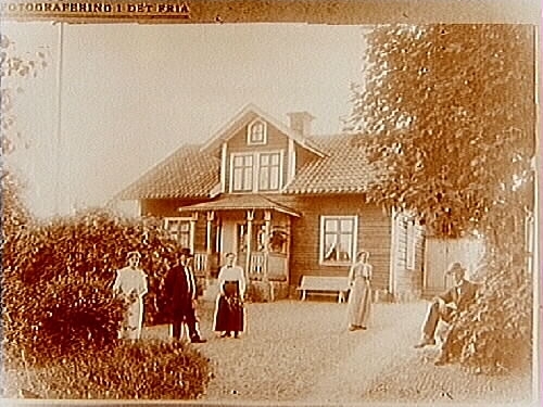 Envånings bostadshus med takhuv, förstubro med snickarglädje. Grupp 5 personer framför huset.