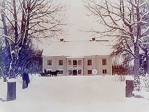 Hjärsta gård, tvåvånings bostadshus i trä, med balkong och förstebro i snickarglädje.
