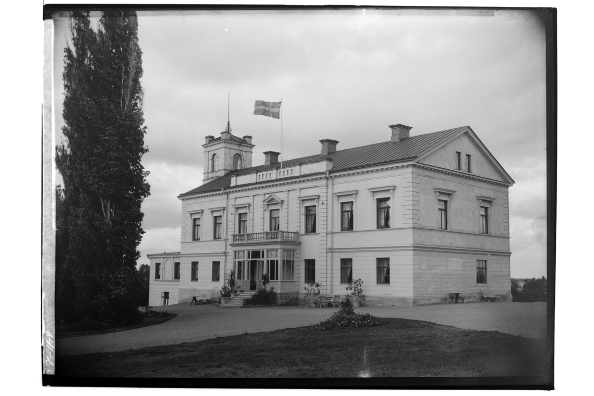 Hjälmarsnäs herrgård, tvåvånings herrgårdsbyggnad med glasad veranda och balkong, trevånings torn.