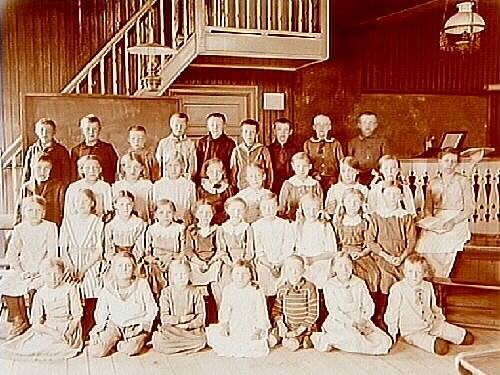 Rinkaby skola, klassrumsinteriör, 35 skolbarn och lärarinnan Emmy Larsson.