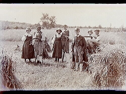 Skördegille, 7 personer, kvinnor och män, i folkdräkter.