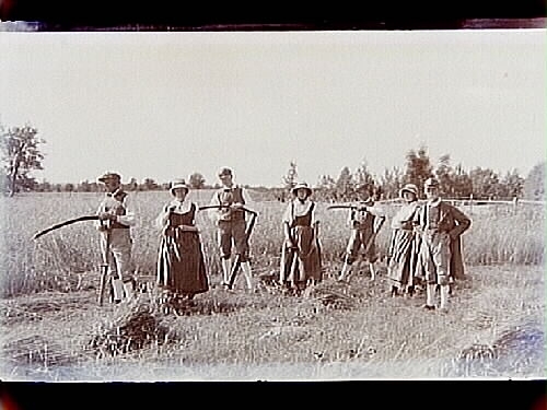 Skördegille, 7 personer, kvinnor och män, i folkdräkter.