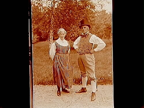 Skördegille, 2 personer, kvinna och man, i folkdräkter.