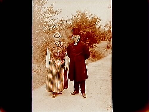 Skördegille, 2 personer, kvinna och man, i folkdräkter.