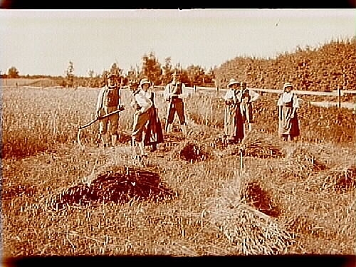 Skördegille, 7 personer, kvinnor och män, i folkdräkter.