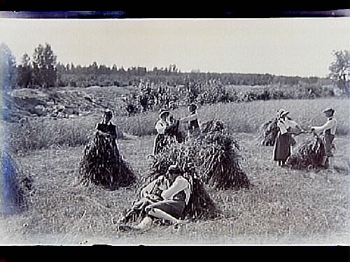 Skördegille, 7 personer, kvinnor och män, i folkdräkter.