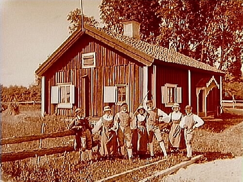 Skördegille, 7 personer i folkdräkt.
