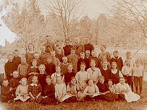 Glashyttans skola, 41 skolbarn med lärarinnan Walborg Ekman.
