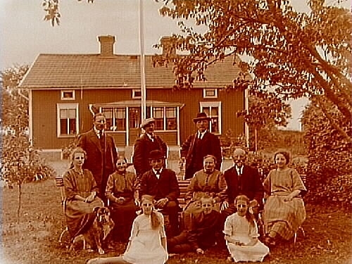 En och en halvvånings bostadshus med glasad veranda. Familjegrupp framför huset, 12 personer och en boxerhund.