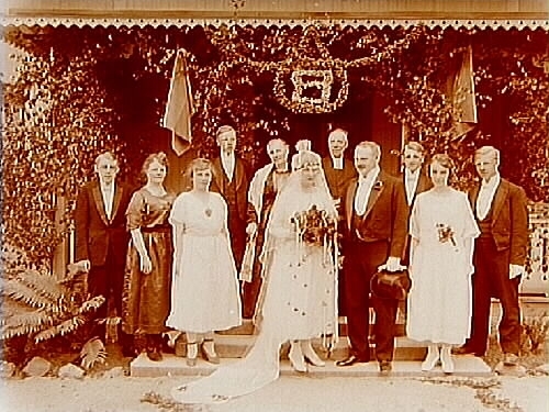 Bruden helt i vitt, med lång slöja och brudkrona. Brudgummen i frack och cylinderhatt.