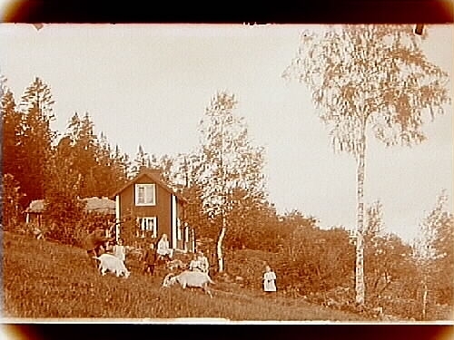Sommarstugan Fridensborg, envånings sommarstuga med inredd vind och veranda. Fem barn och två vuxna framför stugan, 2 getter.