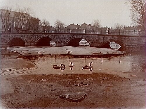 Fem svanar på isen i Svartån, vid Kanslibron.