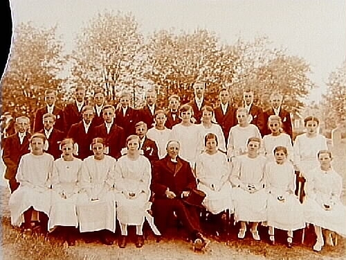 Ekeby konfirmander, 14 flickor, 15 pojkar och prästen.