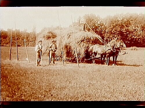 Höbärgning, tre män, 2 hästar spända för ett hölass.