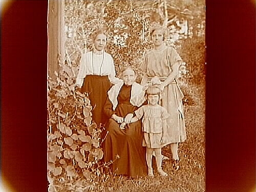 Bilden föreställer Clara Sjöberg sittande och hennes dotter Alma, född 1866 (egentligen Hilma Josefina Ingeborg), Almas dotter Greta, född 1891 och hennes barn Gunnel.