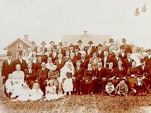 Bröllop. Brudpar och bröllopsgäster. Bruden helt i vitt, med lång slöja, myrtenkrona och brudbukett. Brudgummen i bonjour och hög hatt.